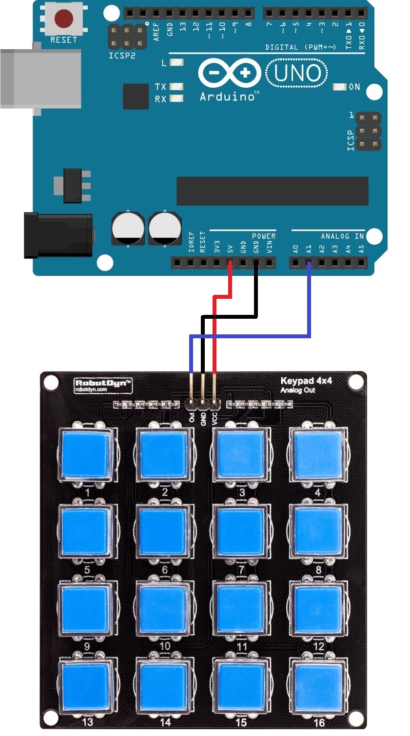 โมดูลสวิทย์คีย์ แบบ 4x4 ปุ่ม สัญญารที่ออกมาจะเป็น Analog ต่อสายไฟเพียงสามเส้น (บวก ลบ และสัญญาณ) ก็สามารถใช้งานได้ โดยต่อกับ Arduino ทางช่อง Analog input